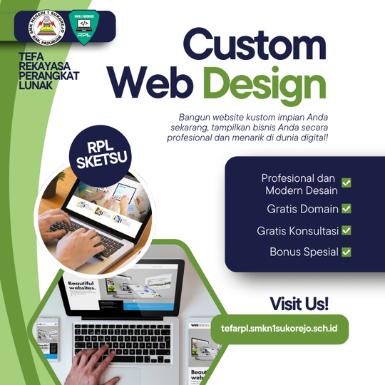 Jasa pembuatan custom website membuat situs web sesuai kebutuhan, seperti untuk sekolah, kampus, industri, atau bisnis, dengan desain dan fitur yang disesuaikan.